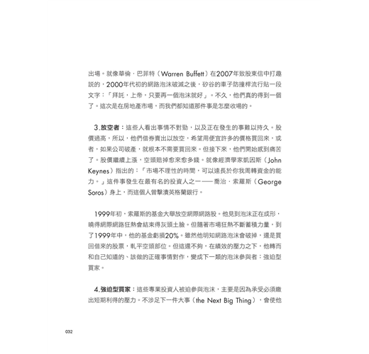 2.聰明人:這些人看出有什麼事情不對勁,但認為他們能算出泡沫何時會破掉。他們會搭乘順風車,一路衝上高峰,然後試圖趕在其他人之前出場。就像巴菲特在2007年致股東信中打趣說的,2000年代初的網路泡沫破滅之後,矽谷的車子防撞桿流行貼一段文字:「拜託,上帝,只要再一個泡沫就好」。不久,他們真的得到一個了。這次是在房地產市場,而我們都知道那件事是怎麼收場的。