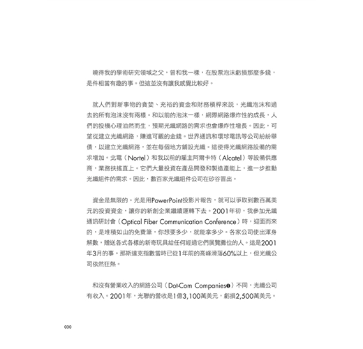資金是無限的。用PowerPoint投影片報告,就可以爭取到數百萬美元的投資資金,讓你的新創企業繼續運轉下去。2001年初,我參加光纖通訊研討會(Optical Fiber Communication Conference)時,迎面而來的,是堆積如山的免費筆,你想要多少,就能拿多少。各家公司使出渾身解數,贈送各式各樣的新奇玩具給任何經過他們展覽攤位的人。這是2001年3月的事。那斯達克指數當時已從一年前的高峰滑落60%以上,但光纖公司依然狂熱。
