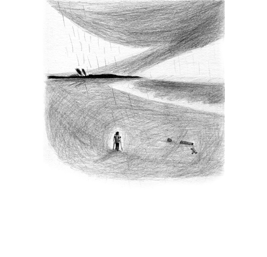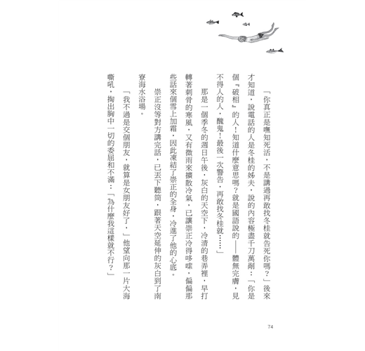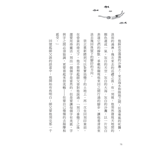 從愈來愈深的海水裡走回路上的過程,重重的腳步踩在軟軟的沙子上時,崇正不只一次的回頭,既看到海水一波波的撲向他的腳後跟,漫過他早已浸溼了的鞋,最後在留下一道長長泡沫的地方漸進的隱入沙子裡並退回,同時也發現來回留在沙灘上的鞋印和拐杖頭的圓印已被抹了去,僅僅剩下幾個走往岸上的腳步……
