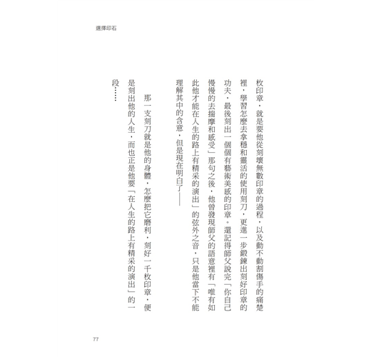 還不僅於此,從刻印章當中,他還悟出自己的人生。他深刻的體會到,刻印猶如經營人生,每傷了手的一刀,都好似一次跌倒;每刻壞即將完成印章的一刀,也好比一次挫折。那麼,握刀愈穩愈不會傷到手,刀法愈熟練愈能刻出精采的印章;同樣的,一次次的跌倒讓他知道了怎麼站得更穩當,一次次的挫折迫使他學會了怎麼勇敢的面對打擊。就是因為那樣,他找到了自信,於是開始像布局印面,也開始規畫自己的未來。