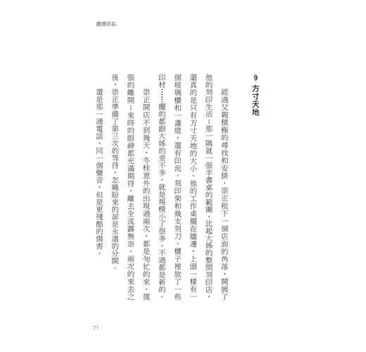 筆者希望透過這本書鼓勵所有讀者,不論世事有多麼的不順遂,都能隨處轉一個念頭,朝正面的方向去想,因為一定有柳暗花明的時候,就像崇正一樣,能突破方寸──刻向印章以外的人生。