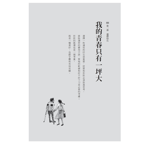 作者國中畢業後,為了日後生活的需要,被逼著選擇當刻印學徒,而他卻能從一枚小小的印章中,悟出他的青春不該只有一枚印章大,也不只有一坪的空間,於是開始追求那方寸以外的青春和人生。他更借用刻印章的歷程:選擇印石、磨平印面、印刻章法、執刀刻印與蘸泥鈐印,來敘事自己執教的過程,其重點或許在強調教育與學習的重要與意義。