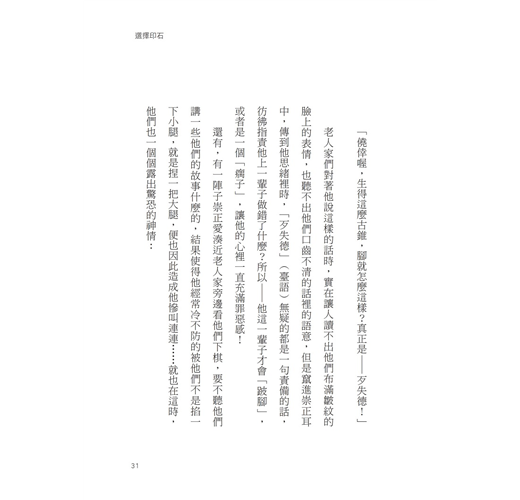 這本書以「並置結構」的方式撰寫,一是他的刻印生涯,先是擔任刻印學徒,再是經營刻印店;另一是他的成長歲月。