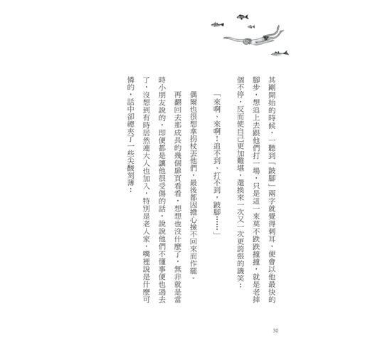 其實,他早聽慣了那些話,偏偏每一次聽來仍然非常不舒服,尤其一剛開始的時候,一聽到「跛腳」兩字就覺得刺耳,便會以他最快的腳步,想追上去跟他們打一場,只是這一來莫不跌跌撞撞,就是老摔個不停,反而使自己更加難堪,還換來一次又一次更誇張的譏笑: