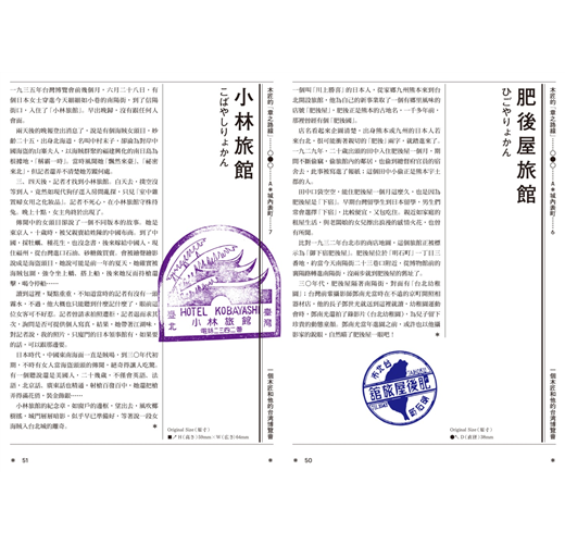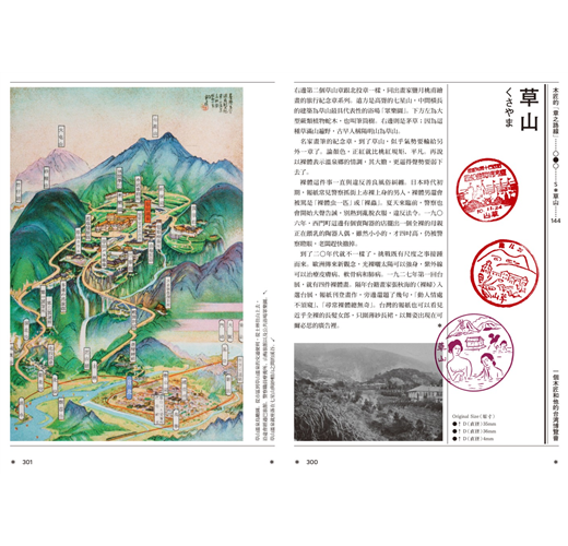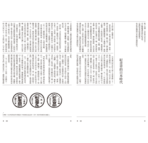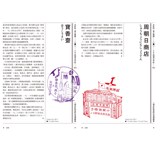 日本時代最早的一枚紀念章是一九○二年的「萬國郵便聯合加盟25年祝典」紀念郵戳,其後這樣的紀念郵戳雖連番現身,但只有一些嚴肅的大日子才有資格發行紀念戳章,或是仍有許多規矩要守,像是蓋得後貼了郵票只能會場內投遞。到了一九三一年,風景名所紀念章才開始冒出頭,購買一錢半的郵票,就可以在郵局蓋得戳章,增添旅遊趣味,隔年全台更有近三十個火車站也推出紀念章饗客。而這一波風潮來到台灣博覽會期間,更是整個大噴發,來到最高潮!本書主人翁楊雲源的集印簿,可說是展示了當年盛況:餐廳、電影院、照相館、書店、文具店、印章店、藥局、菓子店、皮鞋店、布店、咖啡店、旅館、市場、廟宇、神社、溫泉旅宿,全都登場了,於是紀念章的舞台不再只有郵戳和鐵道。