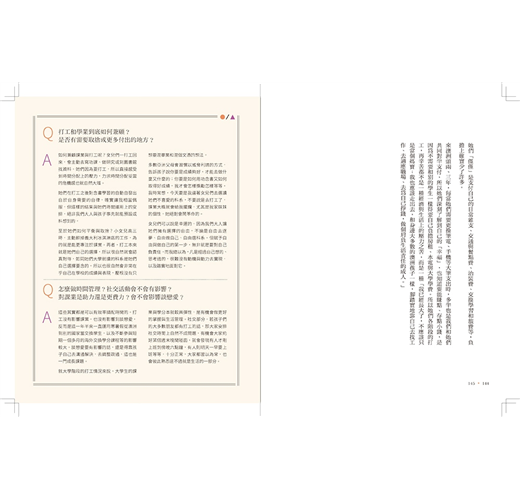 而除了孩子在不同職場的酸甜苦辣故事,更有許多亞洲父母對於教養的Q&A,父母想問的問題,書裡都有解答。