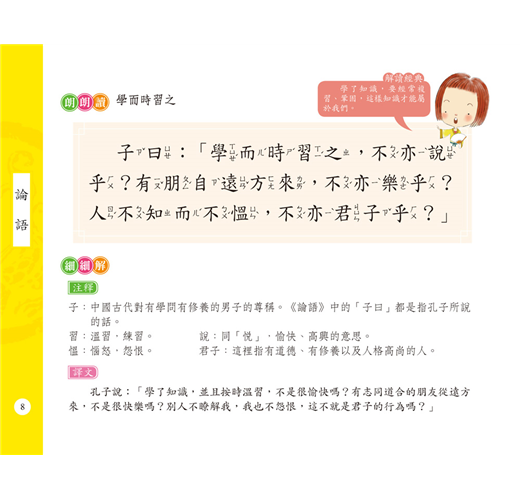 《論語》記錄了孔子及其弟子的言行,集中反映了孔子的思想,是「四書」之一,也是儒家學派的一部重要典籍。本書輯錄了《論語》中的經典語句,用科學簡明的體例,配以充滿哲思的故事,為兒童打造出一本多元素的啟蒙讀本。