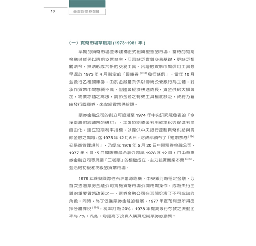 1970年代以前,台灣的金融體系以傳統公營銀行為主導,隨著經濟持續發展,外匯存底快速累積,貨幣供給額攀升,劉大中等中央研究院院士於1974 年倡議建構台灣的貨幣市場,主張控制貨幣供給穩定物價,促進資金運用的效率化與利率的自由化,成為中央銀行調節金融的場域。中央銀行並和財政部推動發行銀行承兌匯票、可轉讓定期存單,鼓勵企業發行商業本票,逐步建立了台灣的貨幣市場。