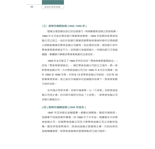 本書第1章回顧了台灣貨幣市場的發展,對票券的主要交易工具及市場交易制度進行剖析。第2章至第4章,針對票券初級及次級市場的運作架構分析,闡述市場參與者多元化的優點,進而探討貨幣市場的指標利率。第5章及第6章分析台灣債券市場的運作架構,涵蓋台幣與外幣債券業務。第7章討論利率衍生性商品,以票券金融業的實務經驗,分析固定收益商品所扮演交易及避險的功能。最後,第8章至第10章論述了票券金融的競爭策略,資產負債的管理實務,討論風險管理的新趨勢,以及票券金融競爭力的關鍵因素。