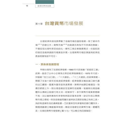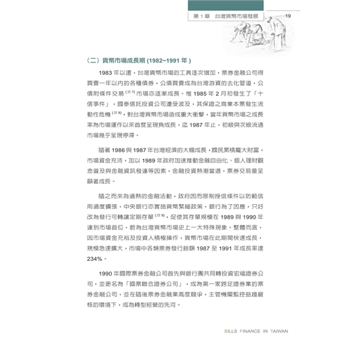 本書第1 章回顧了台灣貨幣市場的發展,對票券的主要交易工具進行剖析,闡述市場交易制度,以及貨幣市場之功能及特性。第2 章至第4 章,針對票券金融初級及次級市場的運作架構,分述獨有的活絡特性,以及市場參與者多元化的優點,進而成為金融市場的重要參考指標利率,發揮了協助金融商品訂價的功能。第5 章及第6 章分析台灣債券市場的運作架構,涵蓋台幣與外幣債券業務。第7 章討論利率衍生性商品,以票券金融業操作的具體經驗,分析固定收益商品所扮演交易的避險功能。最後,第8章至第10 章論述了票券金融的競爭策略,資產負債的管理實務,討論風險管理的新趨勢,以及票券金融競爭力的關鍵因素。