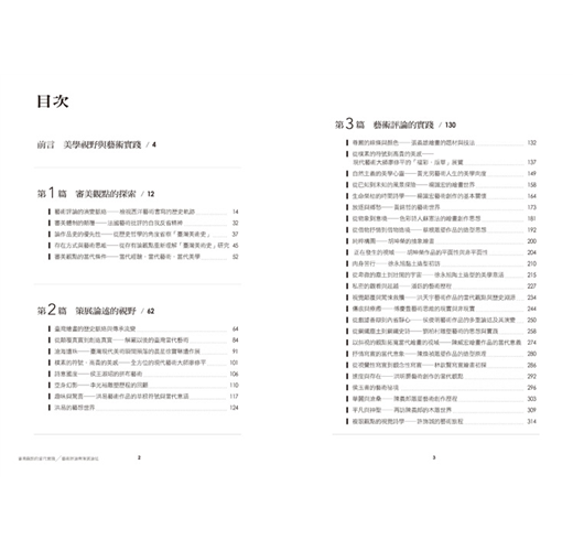 全書分三部分觀察美學在臺灣當代藝術的演繹方式:第一篇「審美觀點的探索」,首先爬梳西方藝術書寫的歷史脈絡,再檢視臺灣藝術研究的發展狀況,為全書審美觀點建立明確的立論基礎;第二篇「臺灣策展論述的視野」,收錄作者多年來為臺灣藝術家策展所撰寫的展覽理念及執行過程,闡述美學觀點在藝術現場的運用與詮釋;第三篇「藝術評論的實踐」則收錄25篇作者針對不同創作媒材、甚至不同世代臺灣藝術家所寫的藝術評論,以當代的審美視角,觀看各種向度的藝術創作,為讀者點評美學在臺灣當代藝術領域的真實表現。