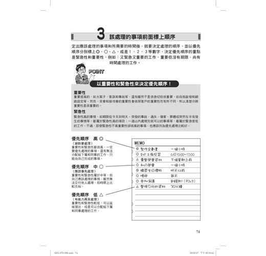 3. 職務管理:無論什麼狀況都能掌握自己的工作,一邊思考行程和目標,一邊按照緩急列出順序,這樣一來就可以全覽工作的樣貌,並決定現在該做什麼好。