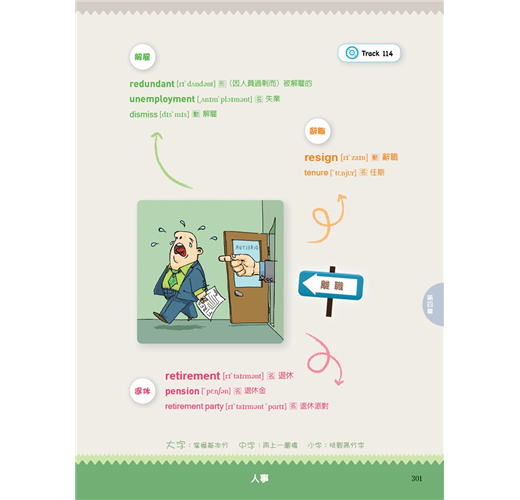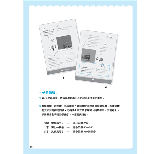 針對新多益 10 大必考情境獨門繪製單字地圖,搭配插畫,並以字體大小區隔單字難易度,運用視覺有效刺激大腦深度記憶,請參見 take a look 內頁的完整版。