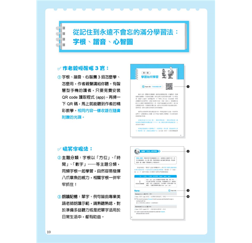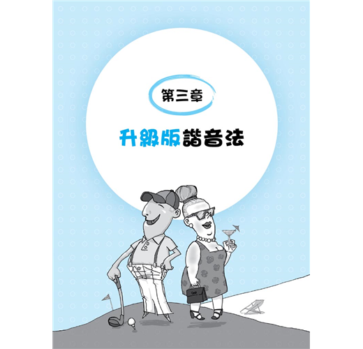 在諧音單元,作者更為單字量身訂作獨門順口溜,透過音韻進一步強化大腦記憶。請試唸下列例句,體會一下順口溜的記字效果。