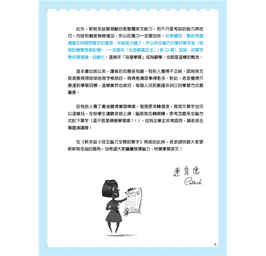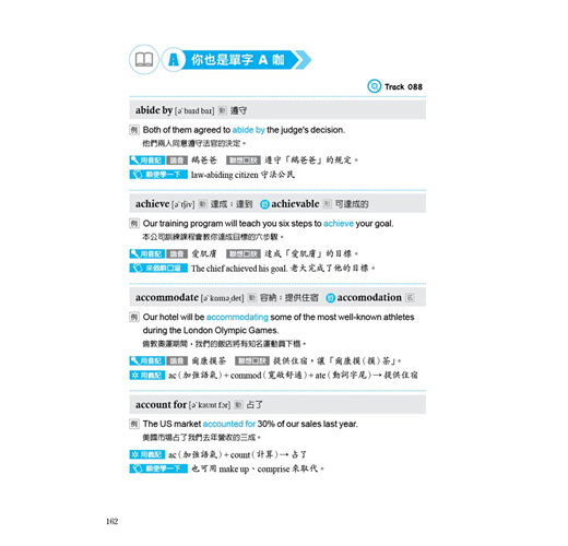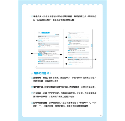 重點單字皆有相關的延伸學習與重點提醒,依學習急迫性貼心為讀者區分為:「順便學一下」、「拜託記一下」、「寓教於樂」等單元。舉例來說,記了 abide「遵守」,作者要你順便多學個 law-abiding citizen「守法的公民」;那 substitute A for B 到底是「用A換B」還是「用B換A」,作者教你怎麼一記成永遠。