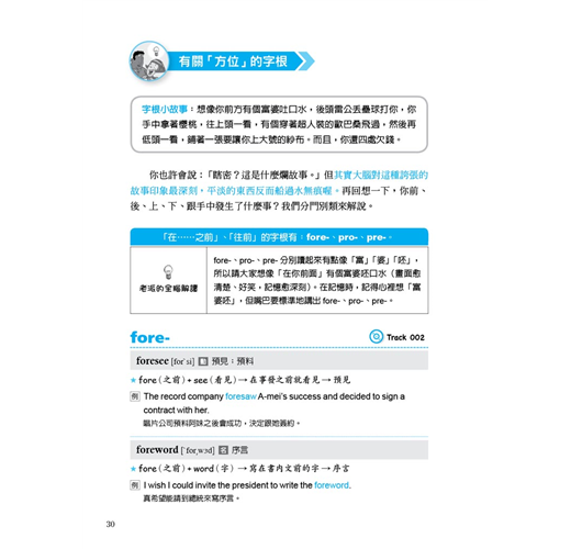 字根、諧音、心智圖3招怎麼學、怎麼用,作者在 MP3 親聲講給你聽;書中的單字和例句也皆由專業美語老師朗讀示範。想要坐著聽、邊走邊聽,甚至躺著聽,通通 no problem!(請參考試聽音檔)