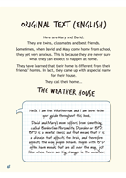 書中以天氣做比喻,描述雙胞胎大衛與瑪莉混亂的兩天家庭生活。故事穿插心理教育專家扮演「氣象員」從旁解說,深入淺出地為讀者解釋主角母親情緒不穩的原因。生動又富涵教育意義的插畫適合所有年齡的讀者閱讀,一起以同理心面對情緒風暴的挑戰。