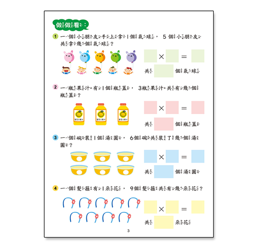 本系列教導基本的九九乘法,配合簡單的應用題,內容設計實用又靈活多變,符合孩子的能力與需求,是學前練習的最佳學習工具。★專為學前兒童研發,做好入學前的準備。★由淺入深,教導基本的九九乘法。★內容設計實用、靈活多變。★反覆練習1~9的乘法,打下紮實的基礎。★字體大而清晰,插圖色彩鮮明。★附解答與72張獎勵貼紙。