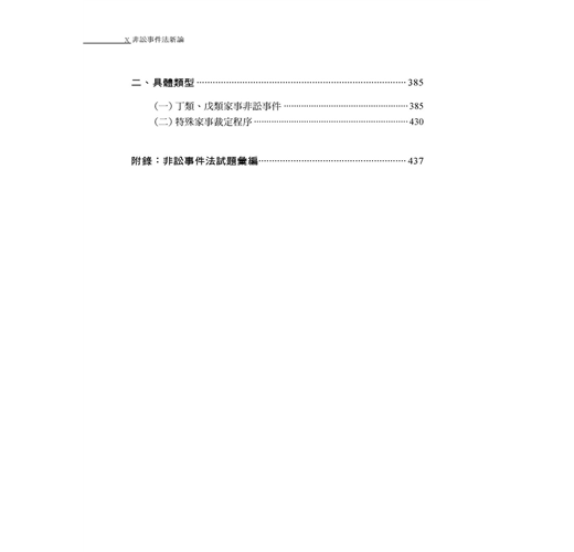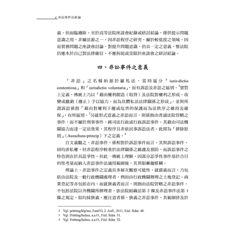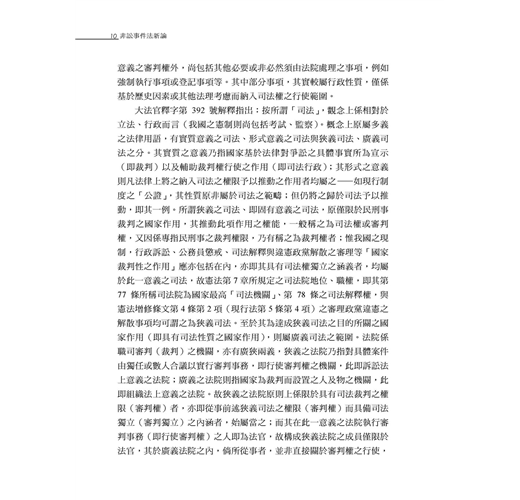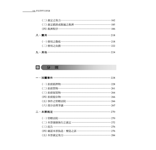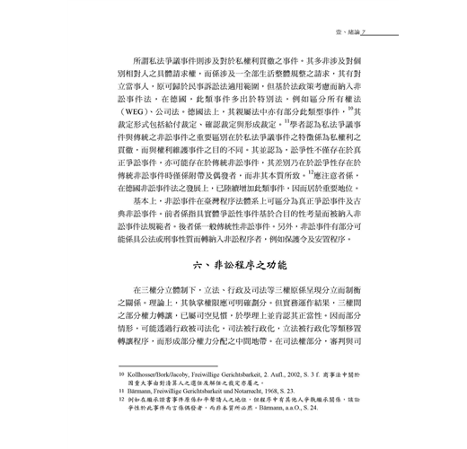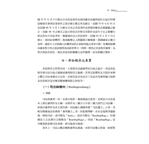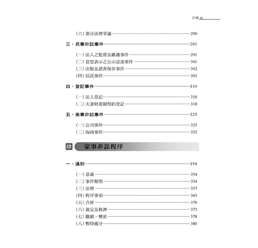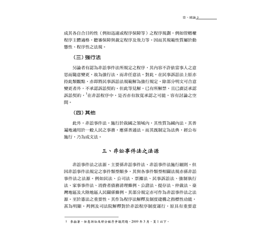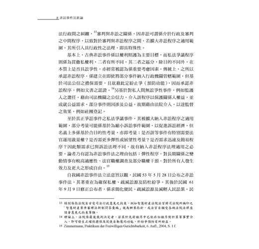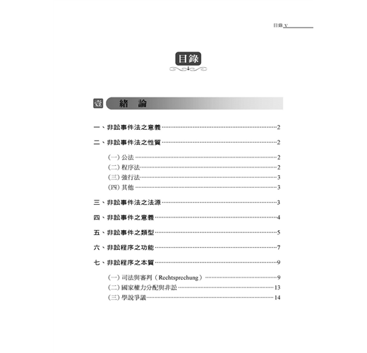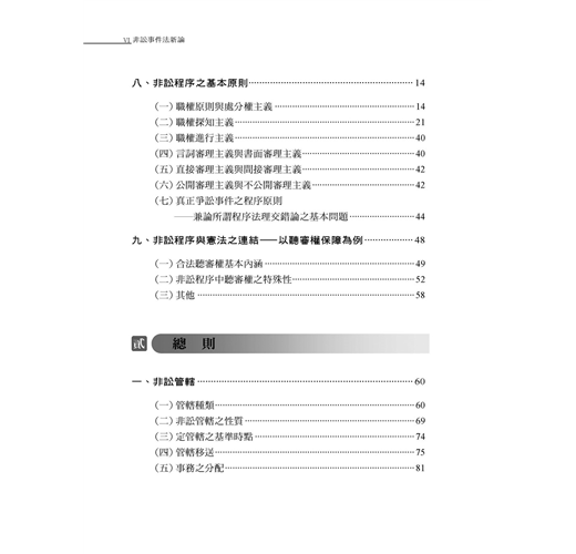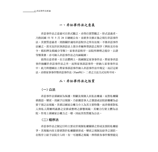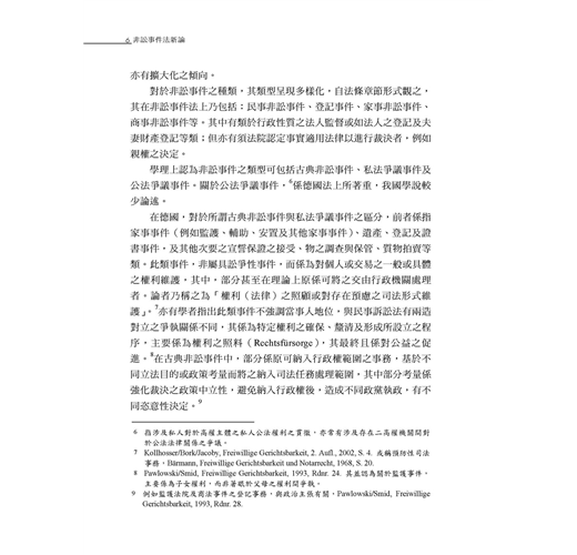 本書係對於非訟事件法之體系性介紹,對於非訟程序法理在我國及德國法上之發展有較為詳細之介紹與比較,而與一般法條說明或僅著重實務見解之書籍不同。但因非訟事件法著重於可實踐性,對於個別法條之解釋適用,自亦應對於其實務見解有所掌握,本書乃亦強調實務見解之蒐集與整理,其亦應有助於讀者對於此法之了解及運用。