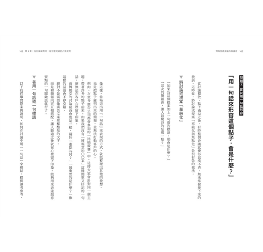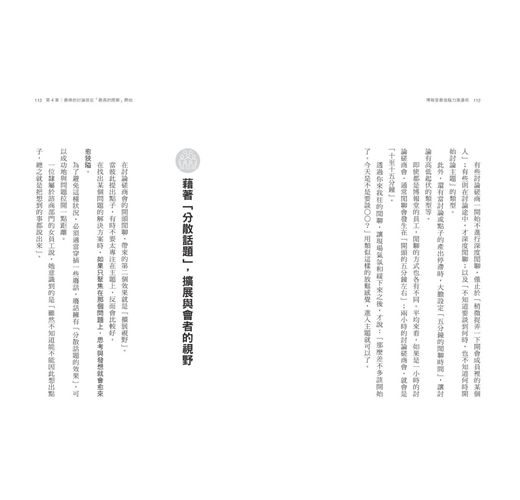 ‧「這是不是和○○很像?」:善用比喻,找出不同商品之間的共同點,有助於檢視目前的討論主題。尤其開會遇到瓶頸時,就可以用這個方法推進。