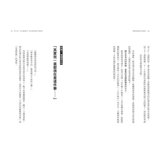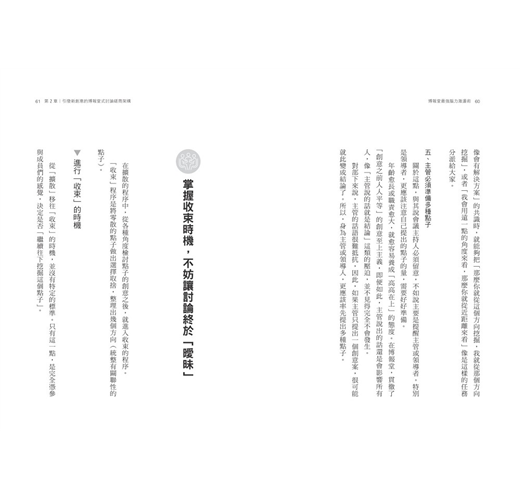 書裡面有可以立即運用的「厲害」點子,以及一些「了不起」的堅持,相信讀者們將訝異「原來開個會需要做到這樣」。