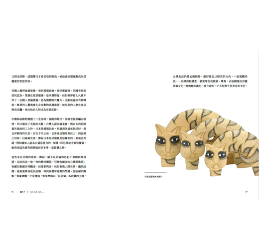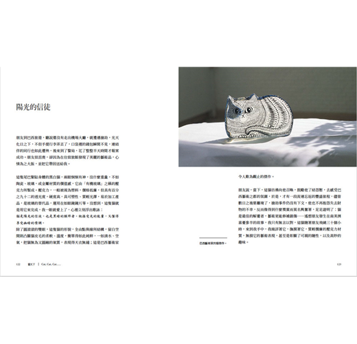 如今,在以貓為題的藝海中,不知不覺已經沉浮了大半生;十八年前,出版第一本收藏之書《貓咪博物館》(2000年,城邦貓頭鷹版),收錄了四百件精品,那算是我青春階段尋尋覓覓的成果,之後,台灣經濟起飛,隨著世界的思潮,社會湧現了懷舊與前瞻兩股力量,科技化則朝著地球村、國際化的人類文明大融合⋯⋯時代改變了,創作更獨立自由、工藝更精益求精,這期間,我遍歷異鄉異國,從愛物中了解各地民情軼事,感受風俗文化的美學表現。