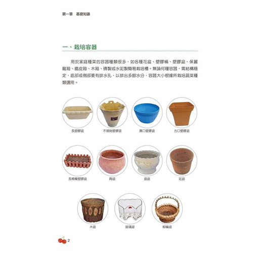 用於家庭種菜的容器種類很多,如各種花盆、塑膠桶、塑膠盆、保麗龍箱、鐵皮箱、木箱、磚製或水泥製簡易栽培槽。無論何種容器,需結構穩定,底部或側部要有排水孔,以排出多餘水分,容器大小根據所栽培蔬菜種類選用。