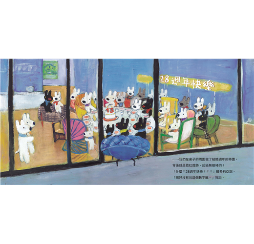 還記得龐畢度中心是麗莎一家人的祕密花園嗎?他們住在一根藍色的大管子裡。這次看麗莎和卡斯柏又搬椅子又扛桌子,好開心,到底是要慶祝什麼呢?生日派對?還是結婚派對?久違的維多莉亞也在新書中一起加入策劃派對的行列,讓我們跟著可愛又呆萌的麗莎和卡斯柏來玩「慶祝」的遊戲吧。