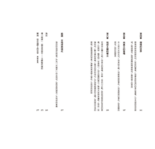 另一方面,雖然本書的用意在於展現歷史的大致流向,但卻不僅僅是為了撰寫一部古琉球的通史而寫。為了展現被編入日本社會以前的琉球王國重要性,本書以陳述它在怎樣的形式下創造了自己的歷史為主眼;儘管在這個時代還有許多令人意猶未盡的問題值得大書特書,但能說到現在這樣一種程度,對我而言已是相當滿足了。