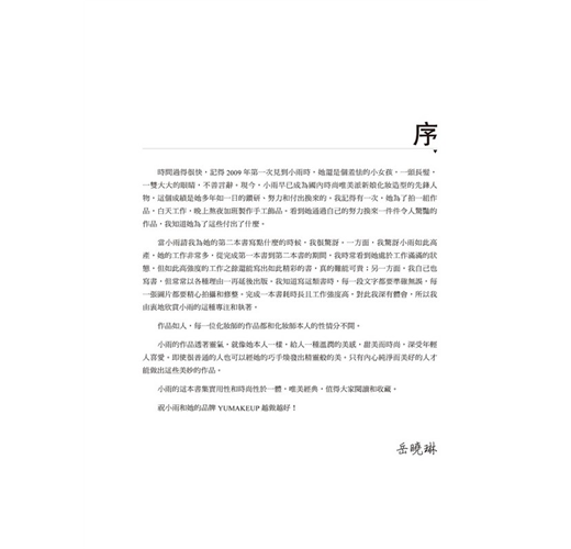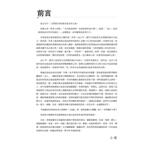 2017年,廣州小雨造型文化傳播有限公司成立。本書作為我的又一部作品,包含了近兩年我在化妝造型方面的最新實戰經驗和心得。能夠以這種特別的方式與大家分享成長和感悟,我深感榮幸。希望書中對於「美」的多元化表達能夠引起更多朋友的共鳴。