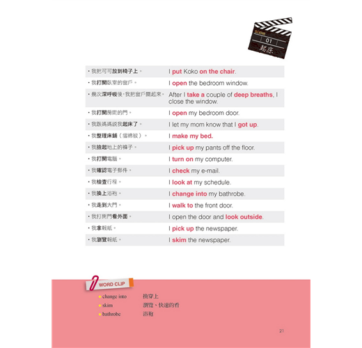 書中還彙整了作者的國外生活經驗談,告訴你如何自己打造一個全英文環境,把英文融入生活之中,用美國人的「一日生活」當教材,讓你習慣把自己的生活用「全英文」度過。