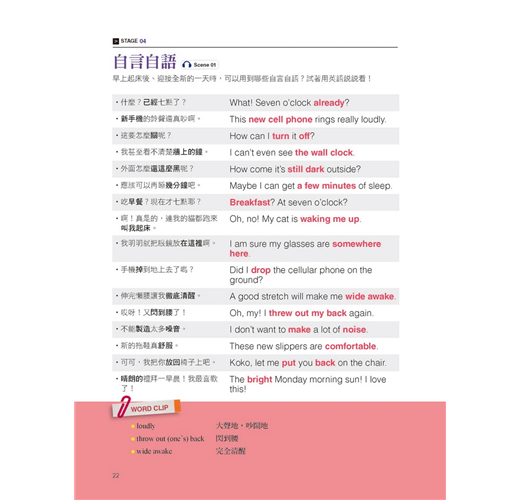本書不浪費時間上課,而是直接讓你練習全英語的生活,使用的句子就是你平常會說的話,不需要找人陪你,只要將自己腦內的想法轉換成英文一樣可以練習,例如:「看來我真的該買新鞋了」、「手機有放到包包裡了嗎?」透過這種練習讓自己都用英文來思考,就能讓大腦習慣英文的模式,自然就能脫口而出!