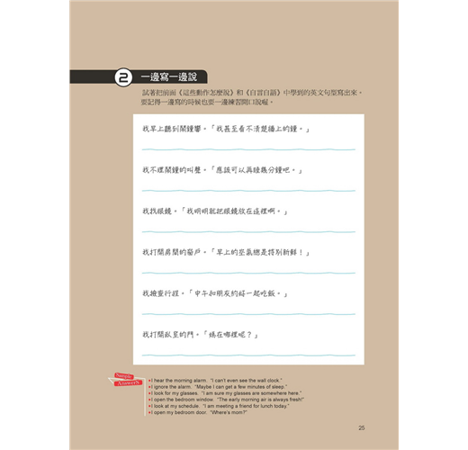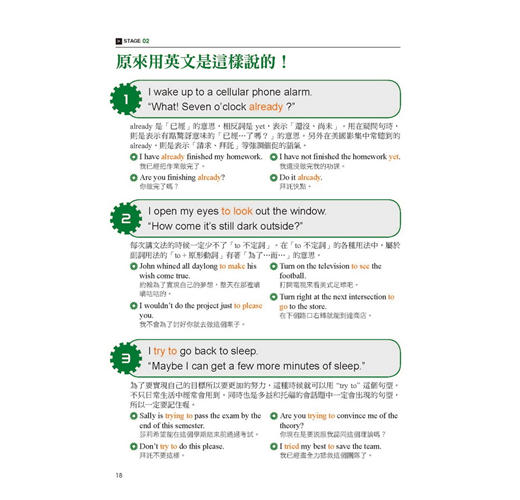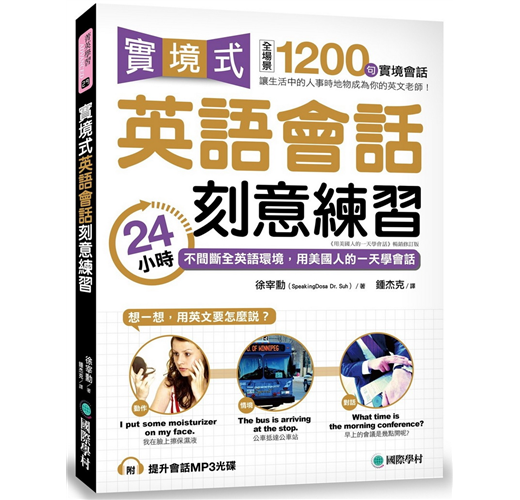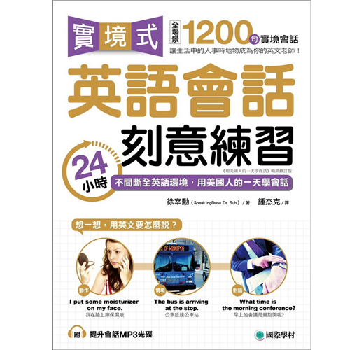 本書教你用精確的方法刻意練習英文,真正學會開口和外國人說話!一般我們開始學英文,大部分就是跟著學校的課本學,沒有太大的目的性,而驗收學習成果的方式則是利用考試,而非真的跟外國人溝通,久而久之,學英語的目的反而變相成為在考試中拿高分,讓英文變成考試用語言而非生活用語言,也就難怪很多人雖然國中三年、高中三年、大學四年,總共花了十年的時間在學英文,但實際運用卻說不出口!別擔心,本書就是以「把英文用在生活上」為編輯中心,設計了許多的生活模擬場景來讓你用英文,經過這樣的訓練,實際運用時一定能不假思索、脫口而出!而且不需要找老師,自己就能在家練習,不受上課時間的限制,想練幾分鐘就練幾分鐘!從早上醒來心中想著 Maybe I can get a few minutes of sleep.(應該可以再睡幾分鐘吧。)準備早餐的時候,自言自語說著 Let’s see what we have in the fridge.(來看看冰箱裡有什麼吧。)這些日常生活會浮現在腦海中的事情,本書教你通通轉換成英文來說,就能讓自己反覆練習英文,之後說英文的時候大腦就不會感到陌生,或是只能說出破碎的片段,透過刻意練習,就能達到說好英文的效果!