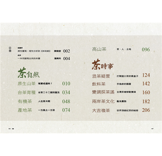茶,不只是消費飲品,背後更緊密貼合台灣人民與土地。從二○一二到二○一八年的無數次現場訪談中,筆尖不自覺地沾上了農人們辛勤耕耘的汗漬與堅毅不撓的淚水,政治與商業則是台灣茶產業上方的無形縴絲!《茶知錄》談的不是茶的時尚,卻是茶的時事,不是品味知識的傳遞,而是嘗試以人文角度,介紹台灣茶在產銷、食安、勞動人力、物種保育、技藝傳承、土地倫理等面向的內省外觀,希望每一個議題都能讓讀者繼續深思,品味一杯茶香的背後,我們要的是一個什麼樣的台茶願景?