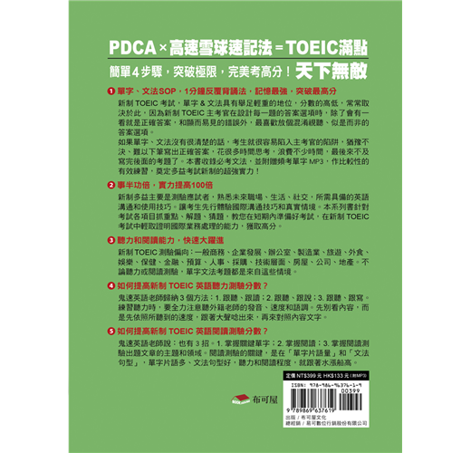 傳授應考教戰策略,迅速掌握主考官的出題方向。聽力&閱讀要拿高分,單字是很重要的,所以要勤一點背單字,背單字可以善用高速「雪球速記法」,反覆念10遍,自然就會,效率最高、印象最深,閱讀& 聽力,同時進行,花最少時間,得最高分數。