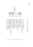 第一章是關於「情報/人脈」。所有的商業行為都是由「人」開始的。我們該建立什麼樣的人際關係、該如何獲得資訊等,都會在這章詳談