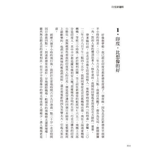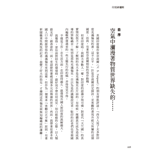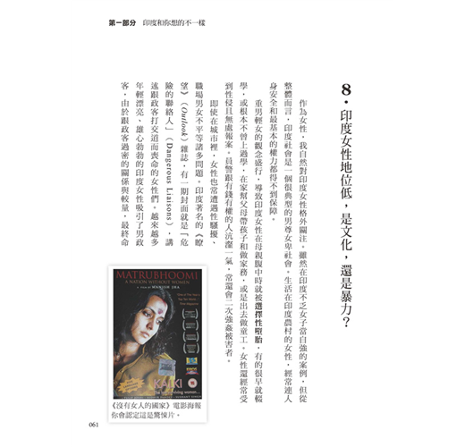 「我被這些偏見壓著,但隨後在印度的生活歲月裡,我用力掙脫它們。」書中這句話像丘比特的箭般刺中我。雖然看待印度最好不帶偏見,但做得到的人卻寥寥無幾。在印度當下,對太多事情易咬牙切齒、憤恨不平。