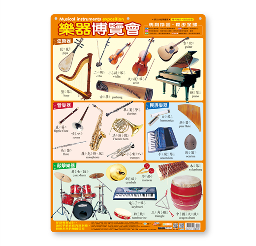 專利掛圖,獨步全球!字大、圖多、畫面清晰,最適合幼兒的多元學習主題。本產品以寫實照片呈現,讓孩子認識中西方樂器的中英文名稱,建立基本認知。專利掛圖,獨步全球!字大、圖多、畫面清晰最適合幼兒的多元學習主題本產品圖文並茂,建立基本認知