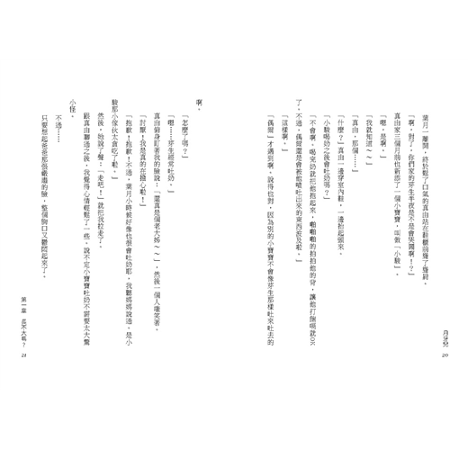 牛奶般的白色液體從芽生小小的嘴巴冒呀冒的流溢出來。手還握著長筷子的媽媽立刻飛奔過來,她將筷子一把丟到地上,抱起芽生,然後用手指頭直接擦拭芽生的嘴巴。