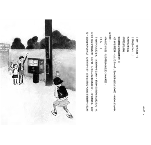 一經過文具店的轉角,就聽見真由的聲音。磯部真由是我最要好的朋友,去年三年級的時候我們第一次同班,才沒多久就變成好朋友了。她身材苗條,高高的,頭髮雖然有點兒短,不過很適合她。站在郵筒前的真由和她妹妹葉月正對著我揮手。