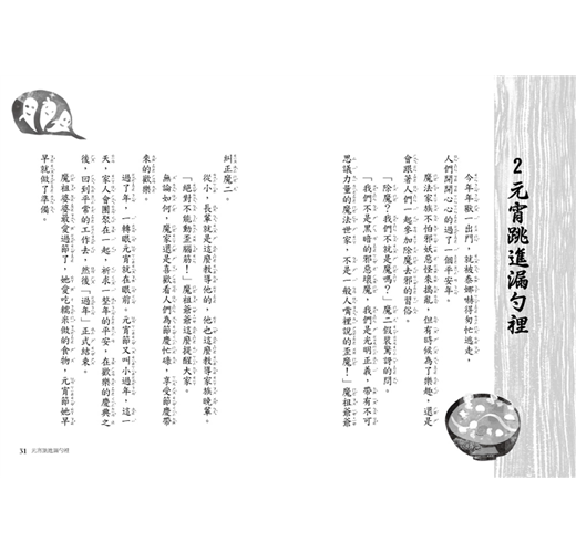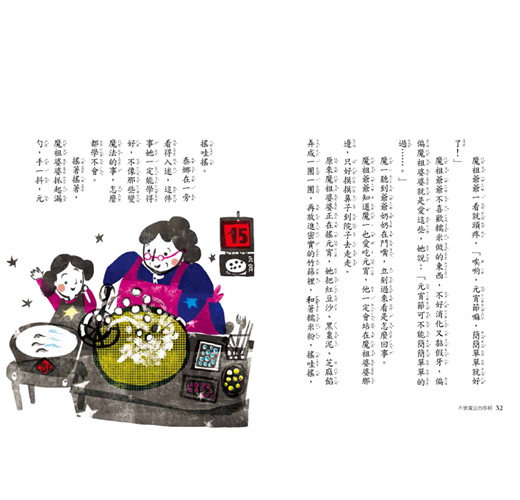 原來魔祖婆婆正在搖元宵,她把紅豆沙、黑棗泥、芝麻餡弄成一團一團,再放進密實的竹篩裡,和著糯米粉,搖哇搖,搖哇搖。