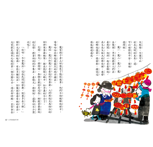 魔祖爺爺也告訴泰娜:「元月的第一個十五日祭太一神,從黃昏直到天明,黃昏時點起長排的燈籠,把夜空都照亮了,一直沿襲到現在,就是元宵夜提花燈的習俗。」