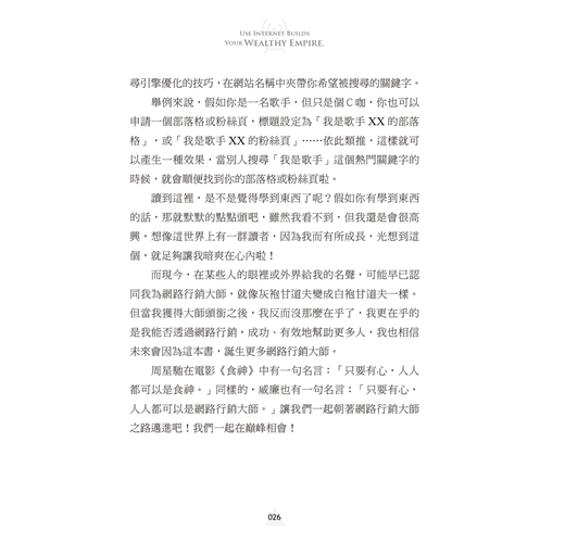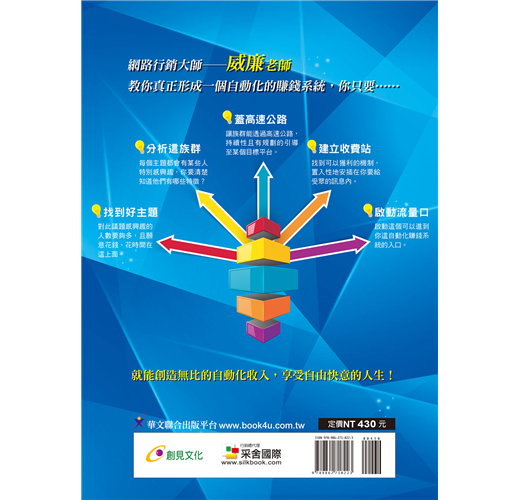 現今這個時代,人人都可以透過網路行銷賺到錢,你只要搞懂流量、名單、轉化,及不對外流傳的網銷太極心法,就能導正你從前錯誤的想法,修正你從前行銷的步驟。阿基米德有一句名言:「給我一個支點,我可以舉起整個地球。」本書將顛覆你對網路行銷的看法,只要連上網路,你就能擁有巨額收入!