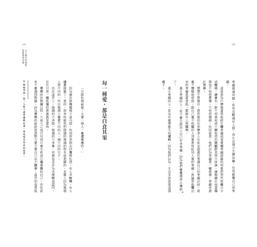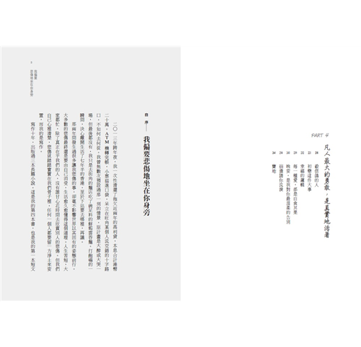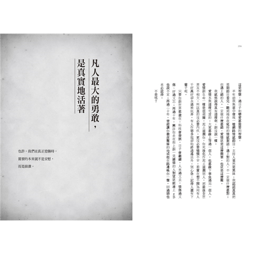 寫作與做人無異,想要深刻,就不能裝傻,必須勇敢直面所有的情感與情緒,當有天發現自己已經可以將悲傷跟快樂平等看待,你便會更加敬畏人生。悲傷不是罪過,反而是解藥,保證一顆活的心不被世俗的標準同化,不被虛假的幸福蒙蔽。悲傷才是時間賜予每個生命最卓爾不群的烙印,也是我們在人潮人海中尋找彼此的座標。