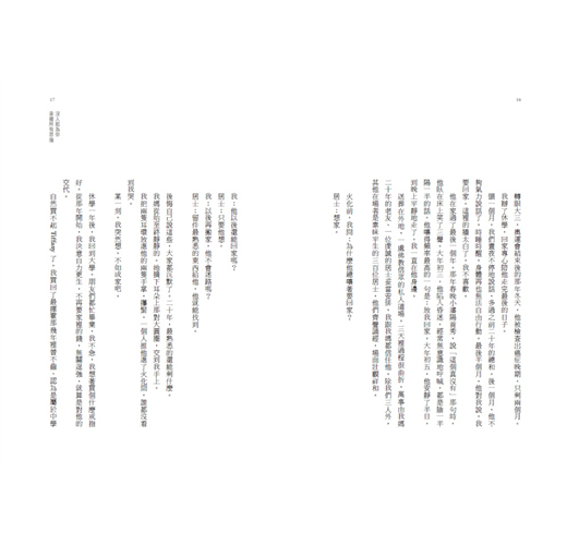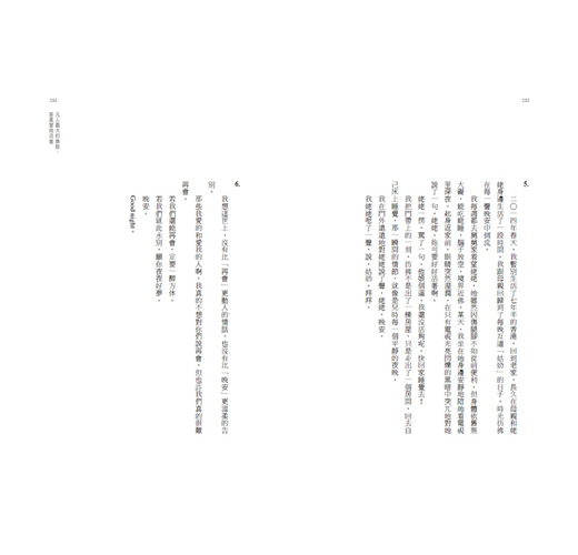 頭一個月,我們晝夜不停地說話,多過之前二十年的總和。後一個月,他不夠氣力說話了,時睡時醒,身體再也無法自由行動。最後半個月,他對我說,我要回家。這裡的牆太白了,我不喜歡。