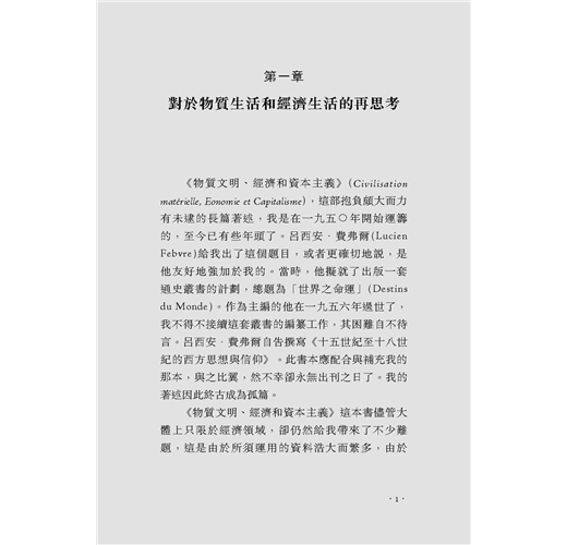 在《物質文明、經濟和資本主義》中,他探討資本主義的發展,不直接從資本主義的表面下手,第一卷先探討這幾百年之中,一般人的日常物質生活,其次再探討與一般人生活相關的交換制度、市場制度。進一步才討論基於這些超乎日常生活的,以少數大商人經營為主的資本主義式經濟的發展過程。
