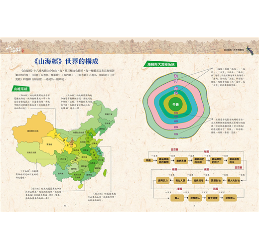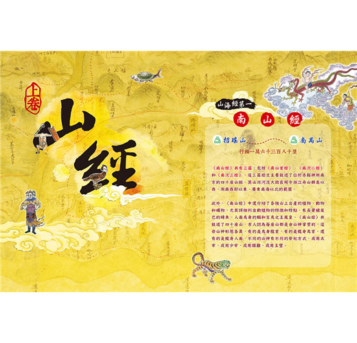 《山海經》全書共三萬一千字,是一部集地理志、方物志、民俗志於一體的古籍。其中展示很多宗教祭祀活動、豐富的民族學知識、奇禽怪獸、異草珍木、東西南北各個方向的山川河流、海內外的邦國,甚至還有神仙譜系的記錄。透過這些記述足以繪製出一幅上古風貌地圖。