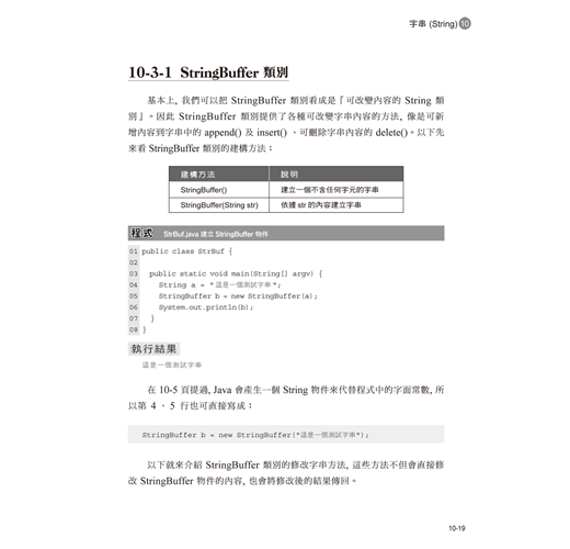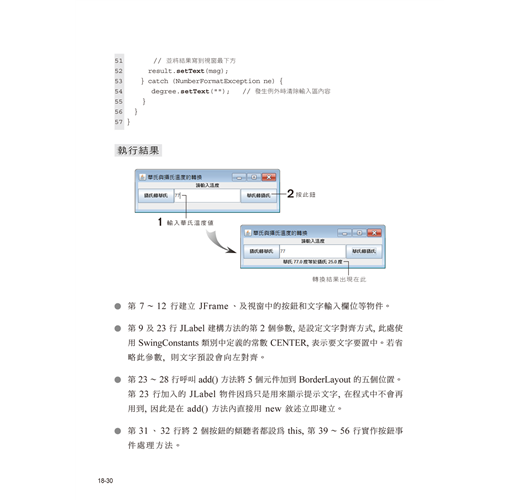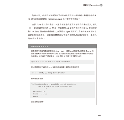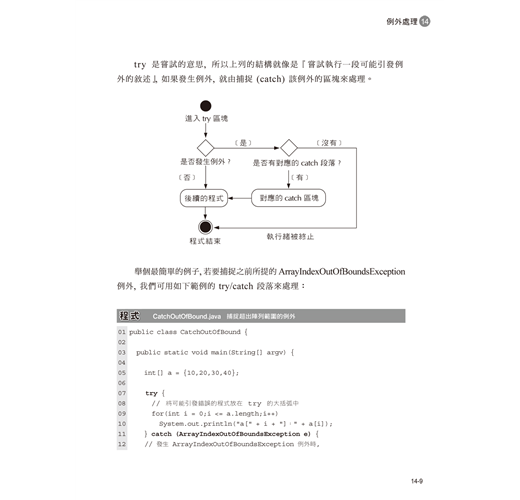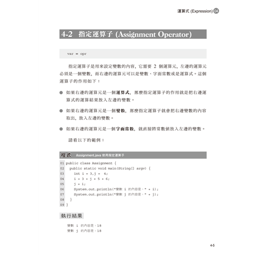 書中以圖文搭配豐富的範例進行解說, 處處可見「正確」、「錯誤」的範例對照, 清楚展示各種語言元素的變化用法與差異, 內容涵蓋基本語法,陣列、物件導向、字串與規則表示法 (Regular Expression)、執行緒的同步與協調、輸出與輸入類別、Lambda 語法、例外處理、Java Collection 類別庫、Swing 視窗程式設計等主題, 從「做」中體會物件導向程式的精髓, 非常適合作為初學入門、紮穩基礎的第一本書。