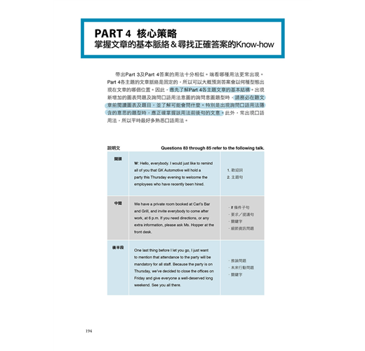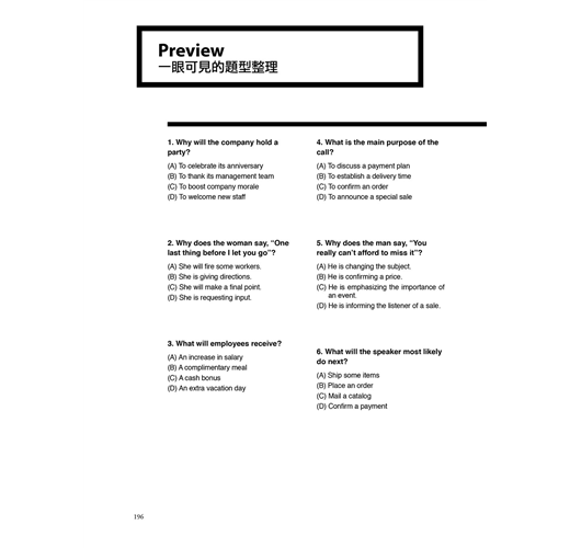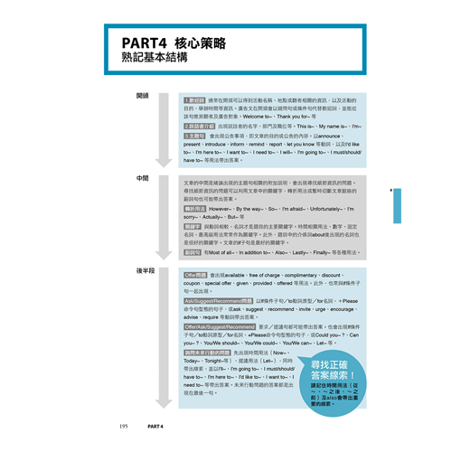 「聽力」、「閱讀」一本搞定!白熒植老師整理出新制多益的出題脈絡,以及題目與答案之間的規律,教你只靠20%聽力測驗的對話、30種閱讀測驗的題型,也能迅速理解題意,選出正確答案!