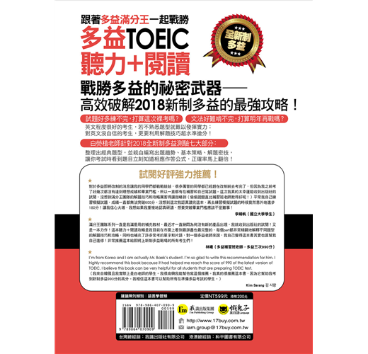 (我來自韓國且我實際上是白老師的學生。我很高興我能幫他寫這個推薦。我真的很推薦這本書,因為它幫助我考到新制多益990分的高分。我相信這本書可以幫助所有在準備多益考試的學生。)